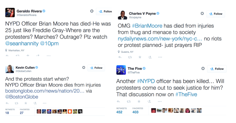 Before I dive into the substance of why this trope is illogical, let’s be clear about one thing: those asking this question don’t really care about slain NYPD officer Brian Moore. To them, the death of Brian Moore is a political prop. Sure, they don’t wish it happened, but they probably didn’t think about it beyond the degree to which it could trivialize anti-police brutality protesters. These are smear artists, so desperate to seek out liberal hypocrisy they’ll knowingly spout this sophistic talking point knowing full well it’s basically bullshit. It’s the laziest kind of pseudo-opinion - a testament to our pundit classes’ fetish for gotchaism at the expense of critical thought.