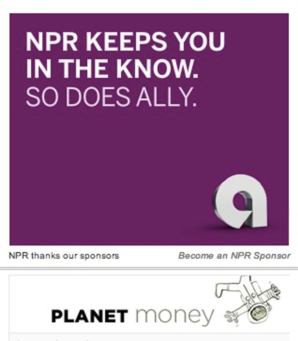 In early 2009, just a few months after Planet Money was launched, NPR announced it had secured Ally Bank (formerly GMAC) as the show's exclusive sponsor. It was an unusual setup for NPR, and unusual (and highly dubious) for anything that called itself journalism, because it meant that a major, troubled financial institution was the only source of money for a news program about finance. At the time that the unusual agreement was signed, Planet Money was the only NPR program underwritten by a single exclusive sponsor. The arrangement raised eyebrows and would have been unthinkable before the crisis—but even by post-crisis funding arrangements, Planet Money's deal with Ally Bank stood out as such an obvious violation of basic journalism standards that even Ad Age, the advertising industry's trade publication, was taken aback by the "close alignment of message and news program."