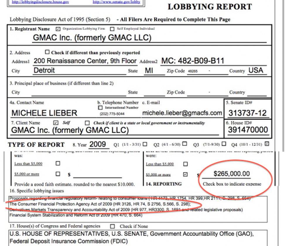 Evidence: Here's just one of GMAC's lobbying disclosure forms mentioning the Consumer Financial Protection Agency Act of 2009