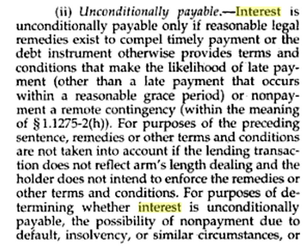 And the latest definition of “qualified stated interest” I could unearth quickly (2007 regs), this section emphasizes that it hinges on the contractual right to receive interest, and to ignore the possibility of non-payment: