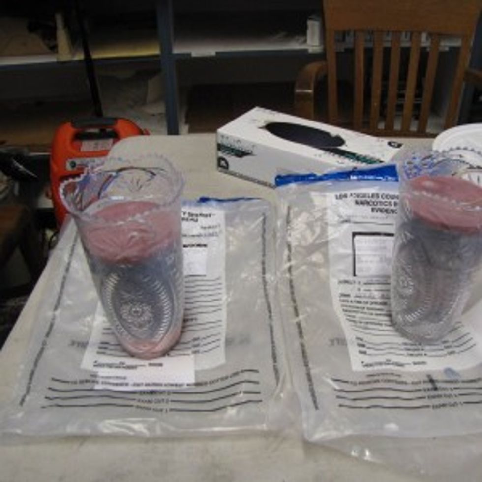 “Two puffs I’m good, three puffs I’m whacked,” is the saying on the street, Det. Frank Lyga said. The amber liquid is PCP, while the pink is wax used in the manufacturing process. Photo courtesy LAPD