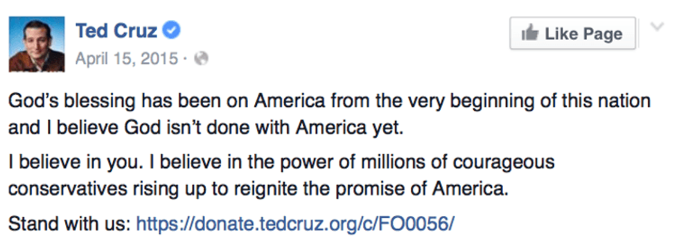 In a Facebook post, Republican presidential candidate Ted Cruz says God has blessed America – before hitting up his followers for money.www.facebook.com/tedcruzpage, CC BY<