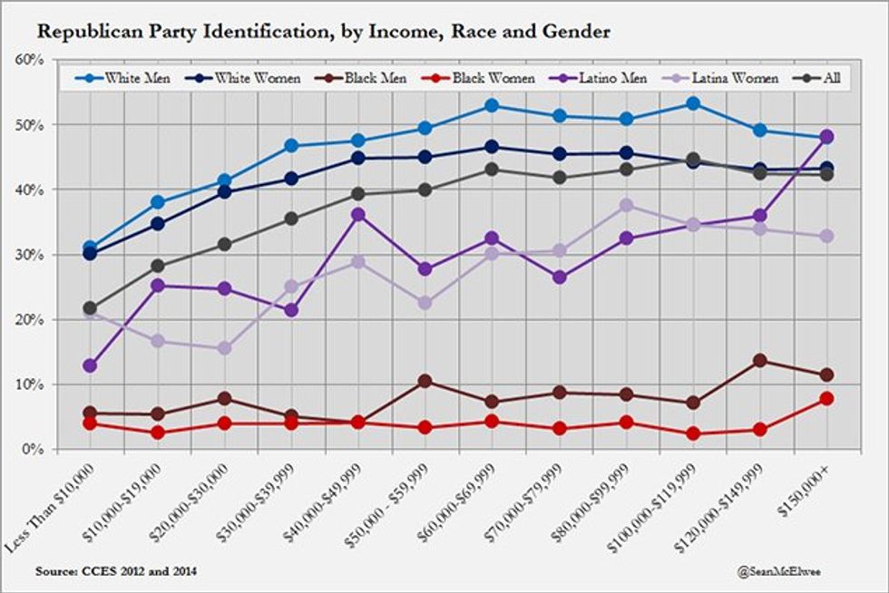 The increasing importance of race and gender in American politics cuts both ways. Working-class white men who would stand to gain from progressive politics may turn away from them due to racial animus (though it is worth noting that low-income white men and women are still less likely to support Republicans than high-income whites). However, the opposite scenario is rarely considered: The increasing salience of race and class may lead many wealthy women and people of color who might hypothetically embrace the GOP’s economic agenda to reject the party because of its perceived racial bias. As the wealthy become more diverse, their traditional support for the GOP may erode.
