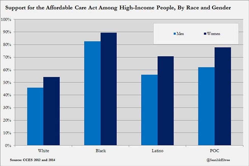I also explored issues related to redistribution and government spending. Fewer than half of high-income white men support the Affordable Care Act (aka Obamacare), compared with 9 in 10 high-income black women and more than three-quarters of all women of color. CCES also includes a generic deficit-reduction question, which asks whether a respondent would prefer to cut defense spending, cut domestic spending or increase taxes to reduce the deficit. High-income white men widely prefer domestic spending cuts to defense spending cuts (49 to 34 percent), and white women narrowly prefer domestic spending cuts (40 percent to 38 percent). Half of all high-income black men and women support defense cuts. High-income Latino men prefer domestic spending cuts (57 percent to 29 percent), while Latina women prefer defense cuts (48 percent to 33 percent). Support for tax increases was lowest among white and Latino men (17 percent and 15 percent, respectively) and highest among black men (34 percent).