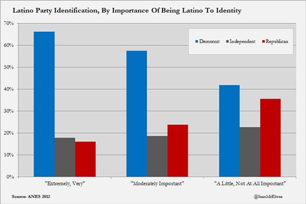 One hypothesis I’ve been considering in the wake of the initial piece with Schaffner and Rhodes is that Latino identity simply isn’t as salient as black identity. Using the American National Election Studies (ANES) 2012 survey, I find that 72 percent of African-Americans say their race is “extremely” or “very” important, compared with 32 percent of whites and 56 percent of Latinos. I find that 66 percent of Latinos who say their identity is “extremely” or “very” important are Democrats (and 16 percent Republicans), while 42 percent of those who say it is “a little” or “not at all important” are Democrats, and 36 percent are Republicans. Research on Asian-Americans has shown that racism can lead people of color who are otherwise sympathetic to Republican positions to support Democrats. The increasing salience of race in this election, and in American politics, may lead even wealthy women and people of color to eschew the Republican Party.