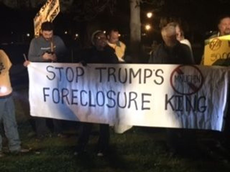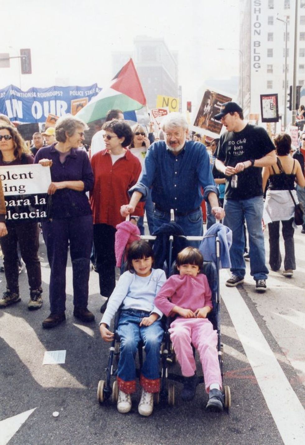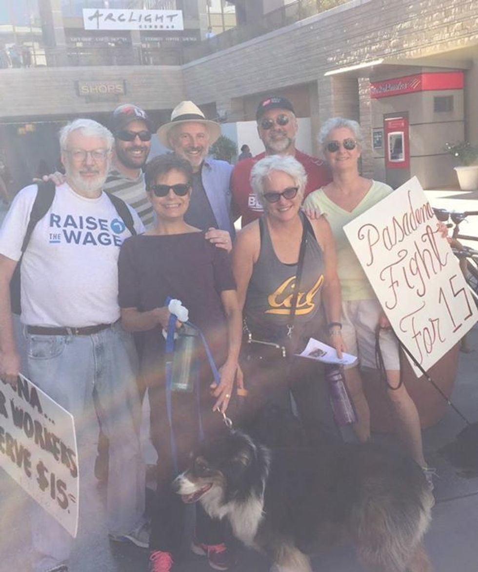 As you can see in the above photographs, I brought my twin daughters Amelia and Sarah to a protest in Los Angeles in 2002 against the U.S. invasion of Iraq and I joined with my wife Terry, our dog Mia, and our friends last year at a huge march of workers and supporters demanding a $15 minimum wage in my hometown of Pasadena. (You’ll be please know that we won that fight). On a rainy night two weeks ago I joined about 150 people at a protest in front of the $26 million Los Angeles mansion owned by Steve Mnuchin, the Wall Street predator (known as the “foreclosure king”) who was your campaign finance chair and whom you’ve nominated to be Secretary of the Treasury. (That’s me, with the gray hair, behind the sign).