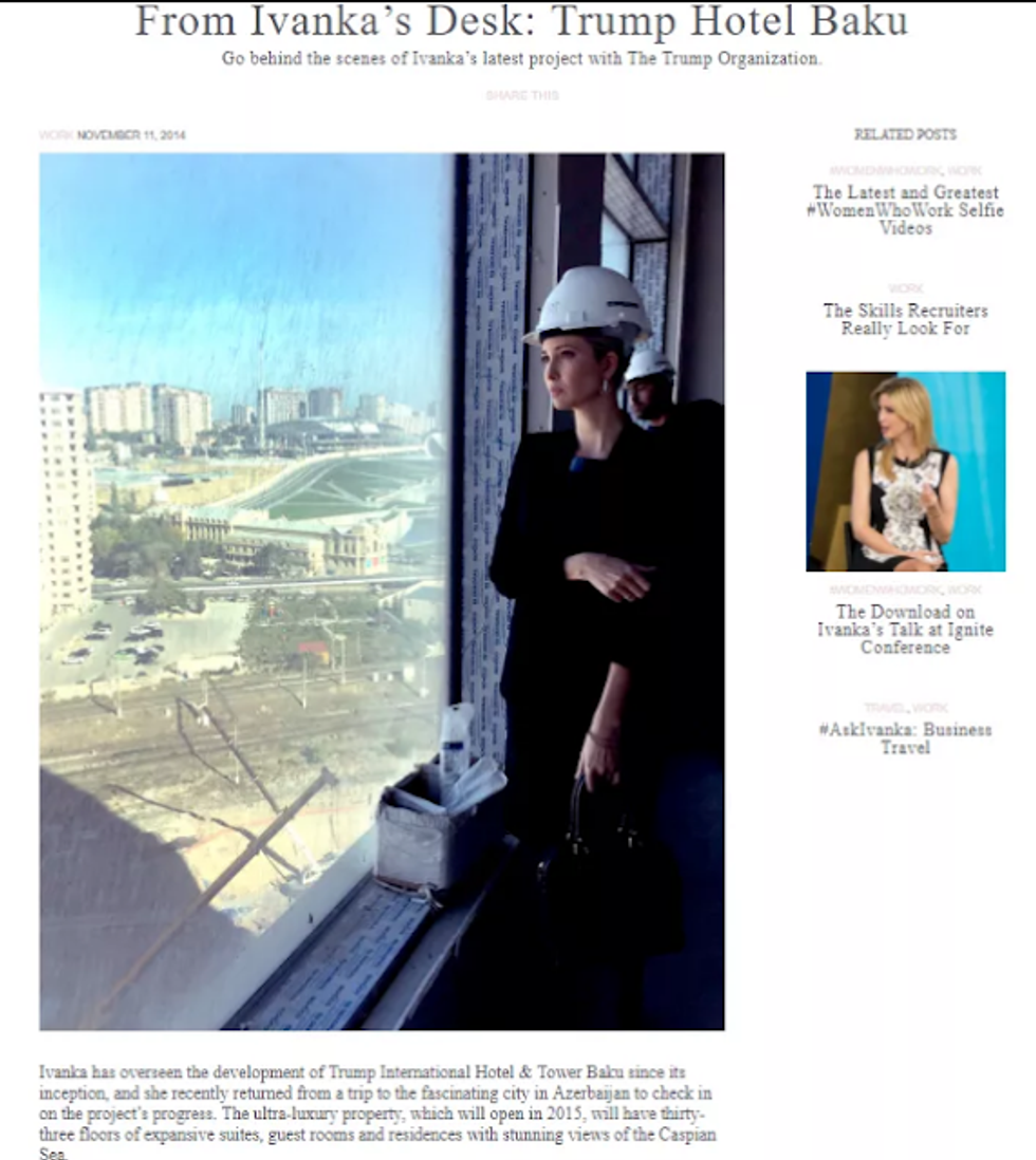 Several senators have called for an investigation into this project, which was finally shelved after Trump was elected. According to Think Progress, "at some point earlier this year, Ivanka removed all information about the Azerbaijan project from her website, although it remains available via Internet Archive."