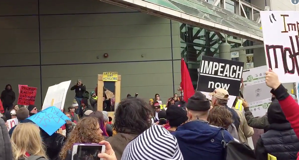 Protesters have made it to the convention center with chants of “Trump must go.” Note guillotine with “let them e… https://t.co/TyG6XdvxW9— Jeff Adelson (@Jeff Adelson) 1547489521