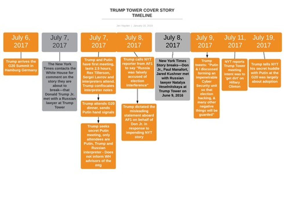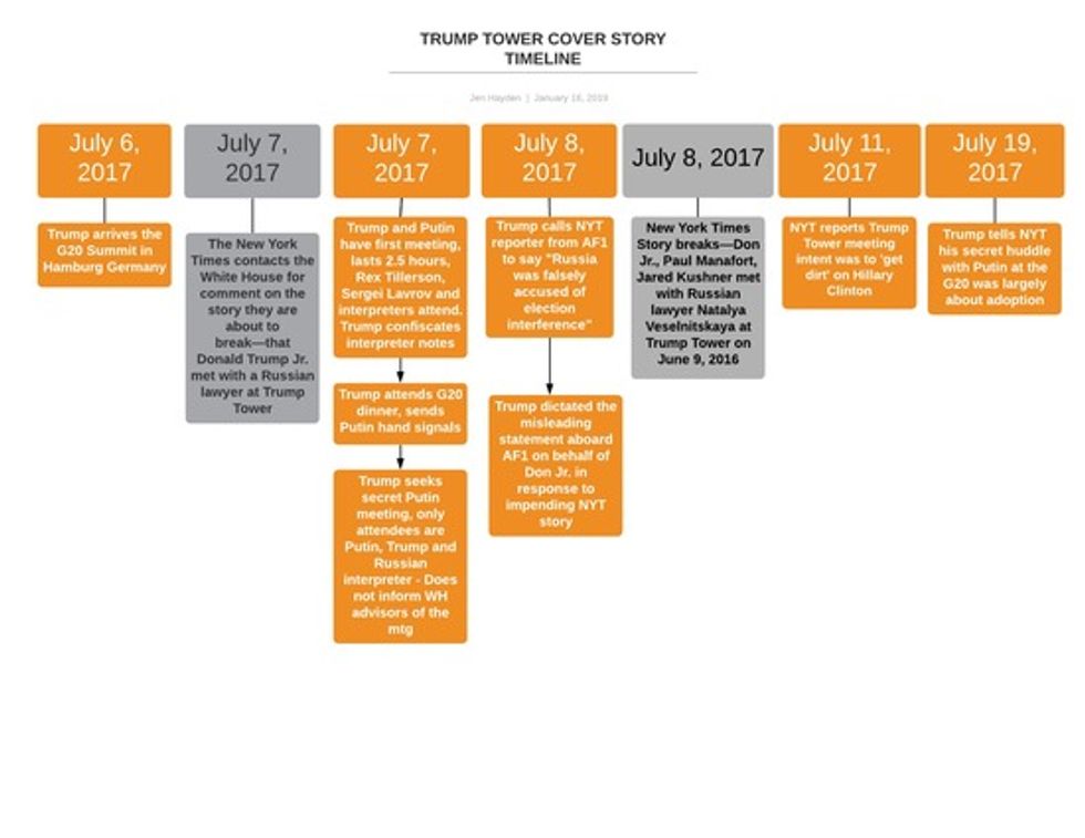 I’ve updated this chart because an astute Twitter user pointed out that Trump’s call to the NYT reporter on July 8 preceded his misleading statement for Don Jr. I also added an entry for July 9, Trump tweeted that he and Putin would be starting a “Cyber Security Unit.”