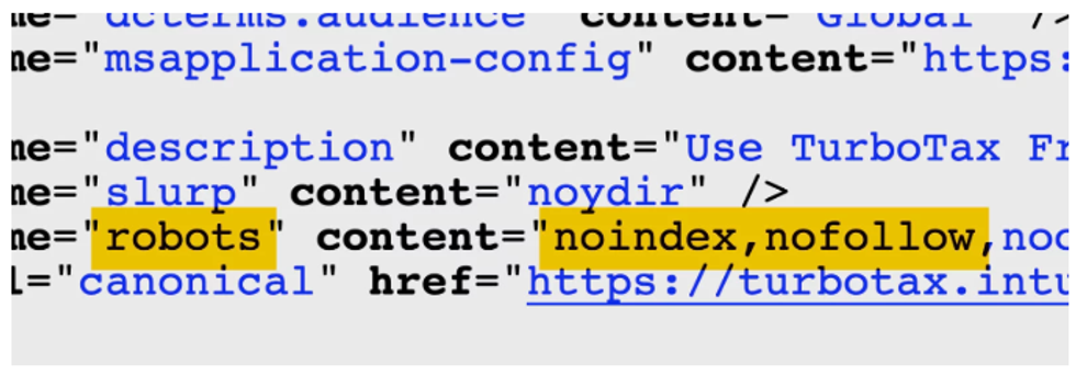 The code on TurboTax’s Free File site says “noindex,nofollow” — instructions for it not to show up in search results.