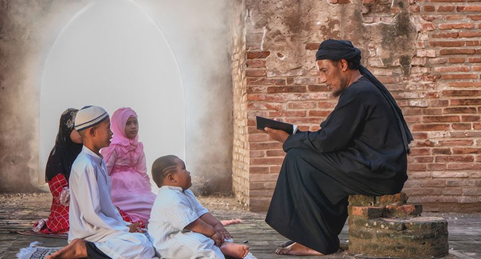 Royalty-free stock photo ID: 1230227107. Muslim teacher teach koran to his children in old mosque.