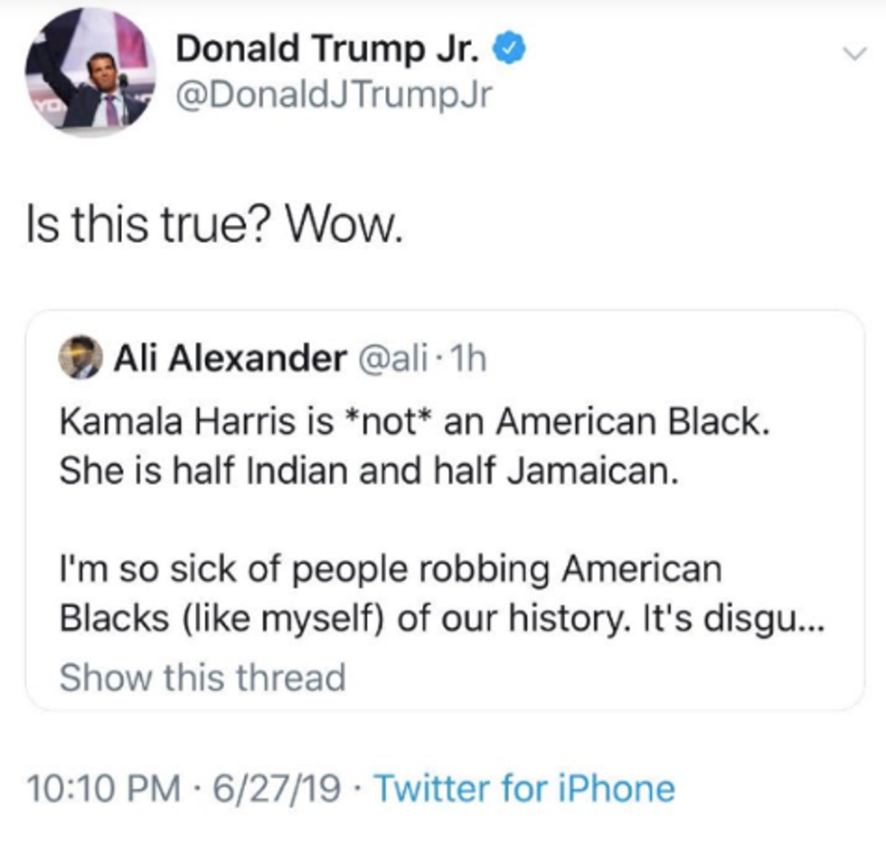 Shortly after Harris dealt former Vice President Joe Biden a devastating blow by questioning his commitment to racial justice, Donald Trump Jr. retweeted a post questioning the California Democrat’s own racial credentials.