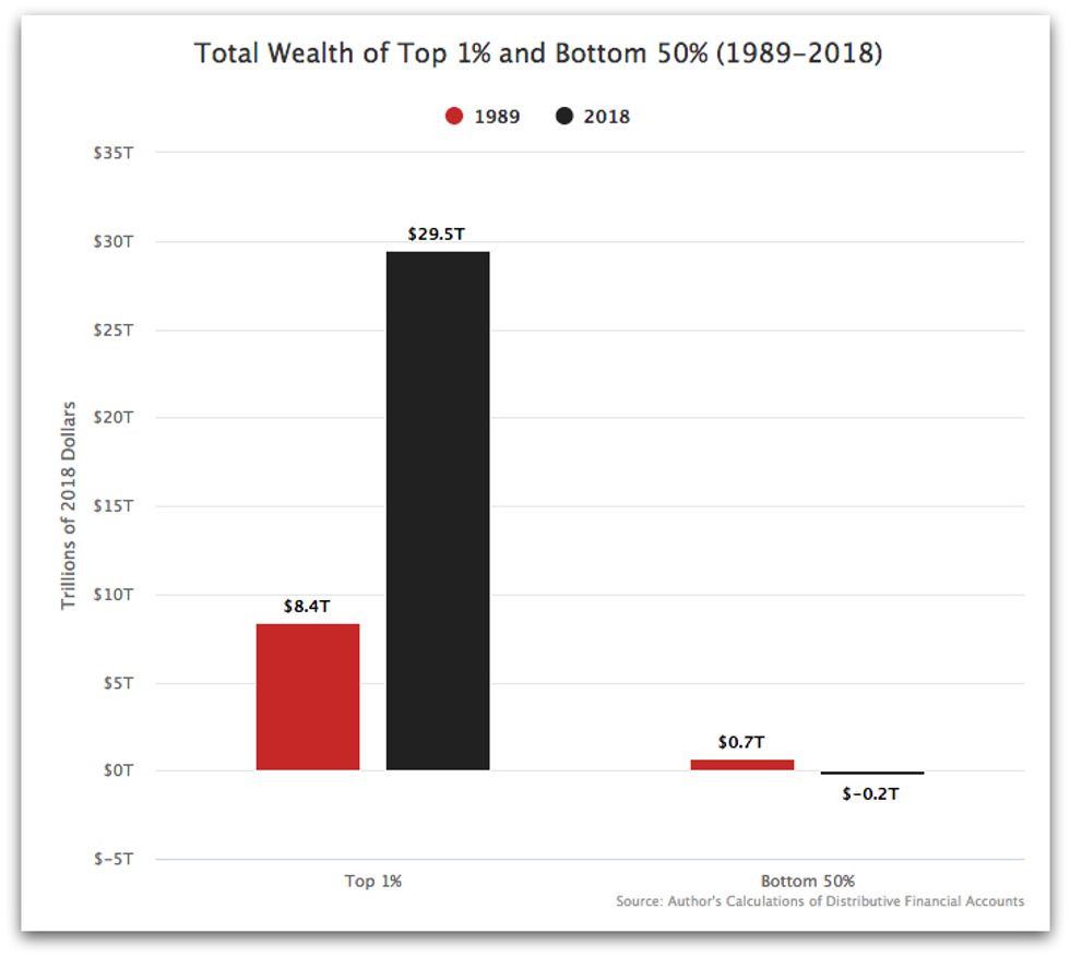 "Between 1989 and 2018, the top one percent increased its total net worth by $21 trillion," Bruenig wrote. "The bottom 50 percent actually saw its net worth decrease by $900 billion over the same period."
