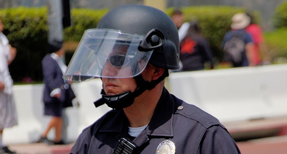 Royalty-free stock photo ID: 1265804. LA Police in riot gear watches over demonstrators at LA illegal emigrant rally. May 1st 2006