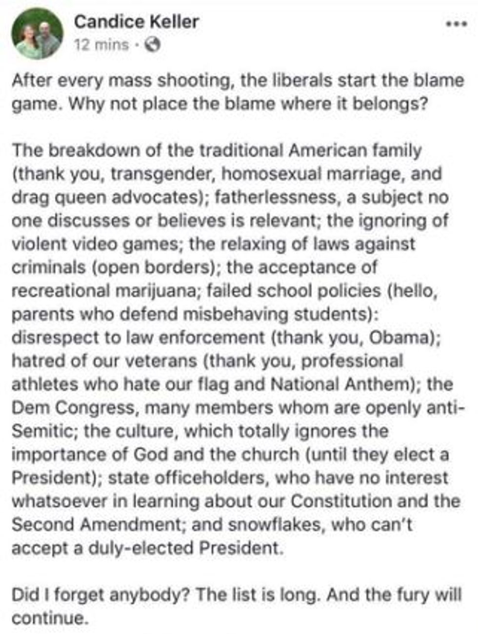 The Cincinnati Enquirer reports that Ohio state Rep. Candice Keller posted an unhinged Facebook rant shortly after the mass shooting in Dayton, Ohio that sought to blame everything but easy access to firearms for the latest massacre of American citizens.
