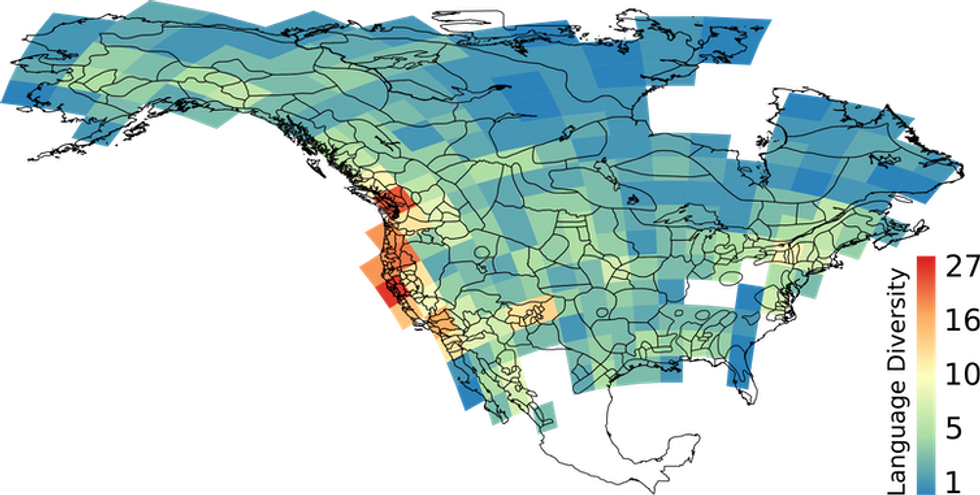 We also found that in some places, such as the high-language-diversity regions on the West Coast, our model could predict the number of languages present very accurately, whereas in other areas, such as the Gulf Coast of the U.S., we have limited understanding of what drove language diversification.