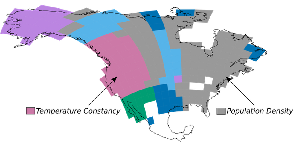 For example, on the West Coast, we found that variability in temperature over time is a key driver linked to language diversity. This result provides some support for the idea that in areas with more stable environmental conditions, human social networks can be smaller and more languages may exist.