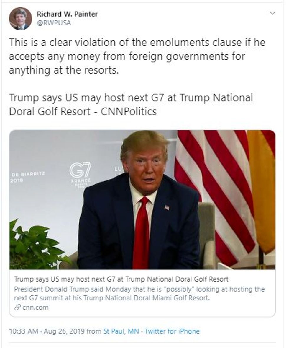 “This is a clear violation of the emoluments clause,” Painter tweeted after Trump spoke Monday.