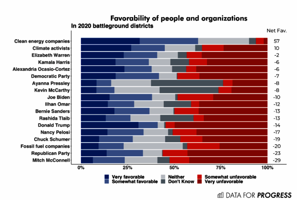 Polling is beginning to support that as well. A new battleground district poll from Data for Progress found that Senator Elizabeth Warren had the highest net-favorable ratings among the presidential candidates tested, that Ocasio-Cortez is viewed roughly as favorably as Joe Biden — and more favorably than Donald Trump or the Democratic leadership, and that “clean-energy companies” and “climate activists” both poll far more favorably than “fossil fuel companies”: