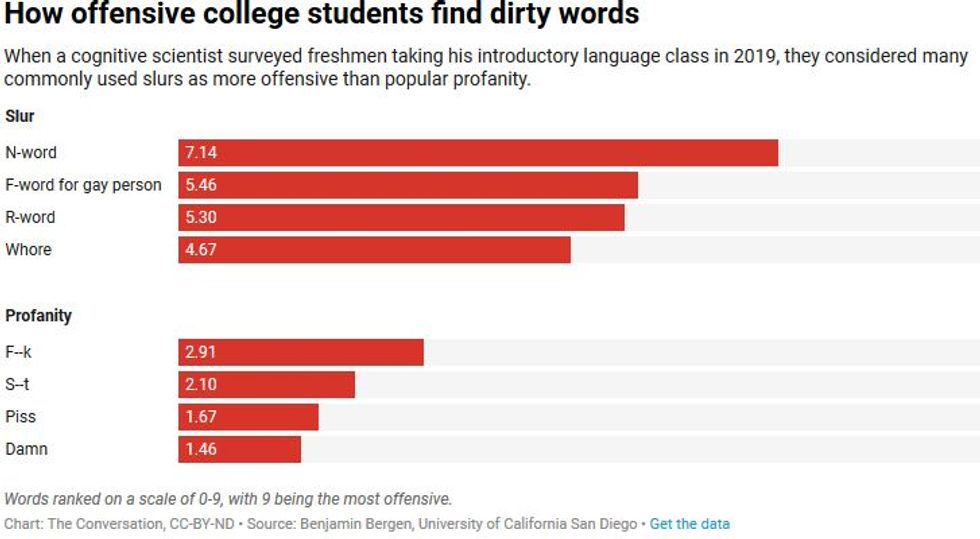 For example, the second-most-offensive word according to the undergrads taking my survey this year is a different F-word – a three-letter slur used to disparage LGBTQ people. No. 4 is the R-word – a six-letter slur used against people with intellectual disabilities. These are among a host of slurs that even mental health professionals once used without compunction but that young adults like my students now reject.