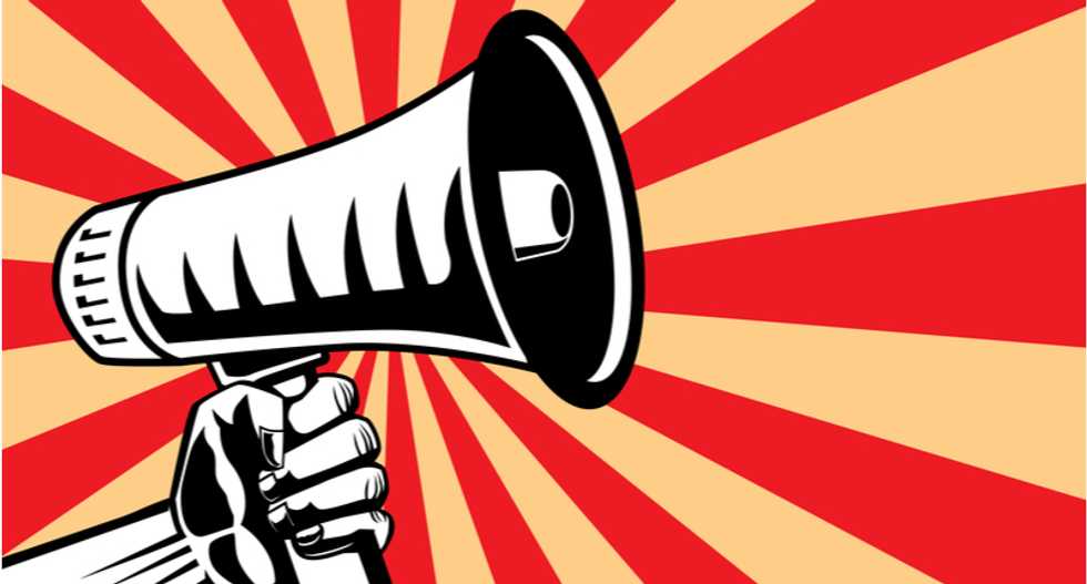 Hand reaching out a megaphone on shine background. Illustration in pop art and retro style. Shutterstock