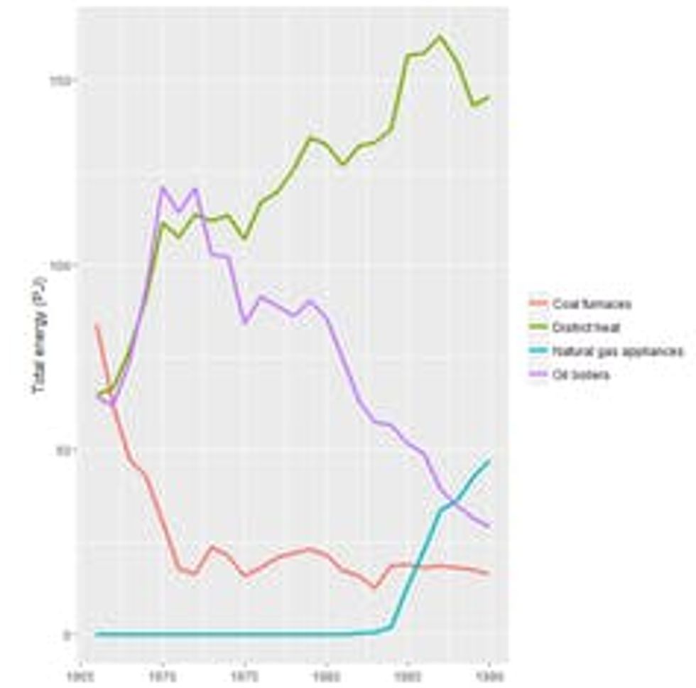 As with the previous two examples, this change was done through deliberate intervention, which was handled mainly by municipalities. In some places, municipalities banned the installation private furnaces. In others, they offered interest-free loans to energy cooperatives. This coordinated national strategy led to a rapid increase in the share of district heating in the Danish heating system.