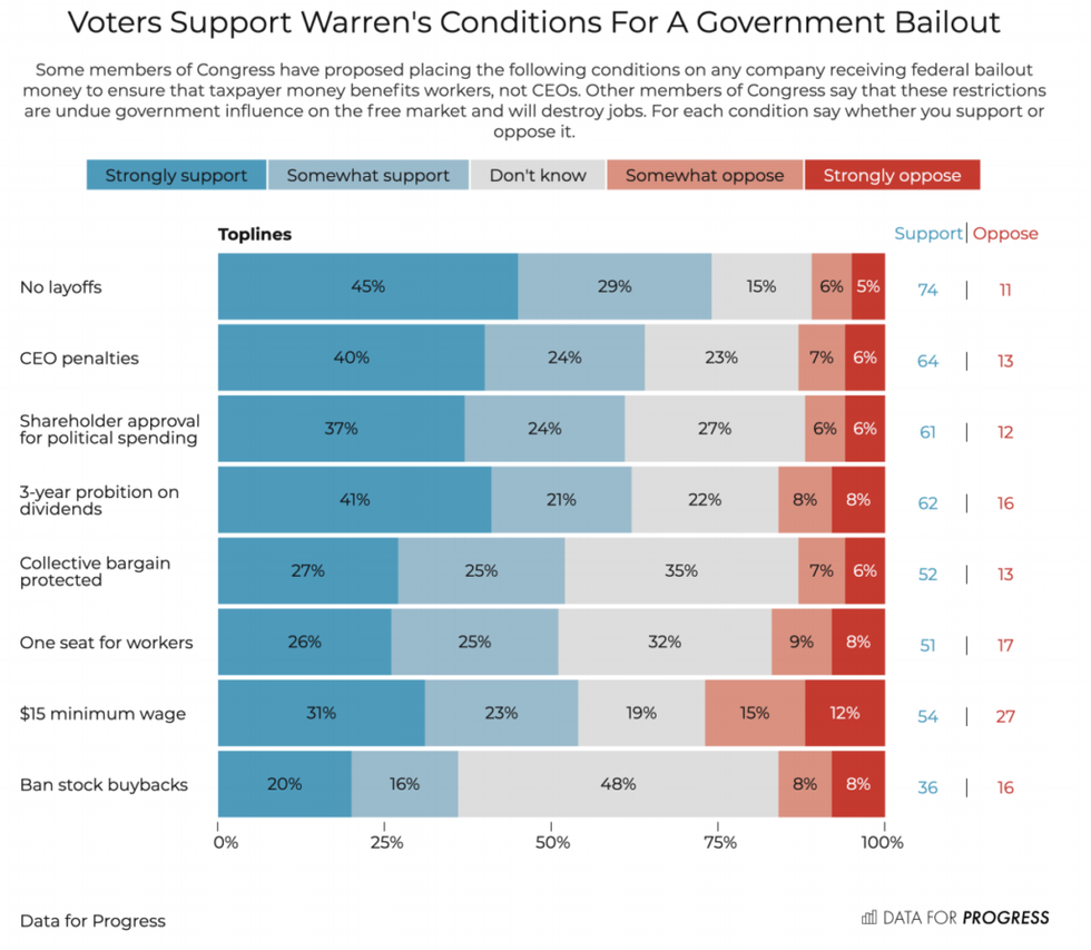 Trump's claim that he would "be the oversight" for a huge amount of funding was clearly a non-starter. Meanwhile, most of the provisions Democrats fought for were recently proposed by Sen Elizabeth Warren, and Data for Progress conducted a survey to gauge public opinion about those measures. Other than barring bailed-out companies from buying back their stocks, which half of respondents didn't understand well enough to form an opinion, they all proved to be extremely popular.