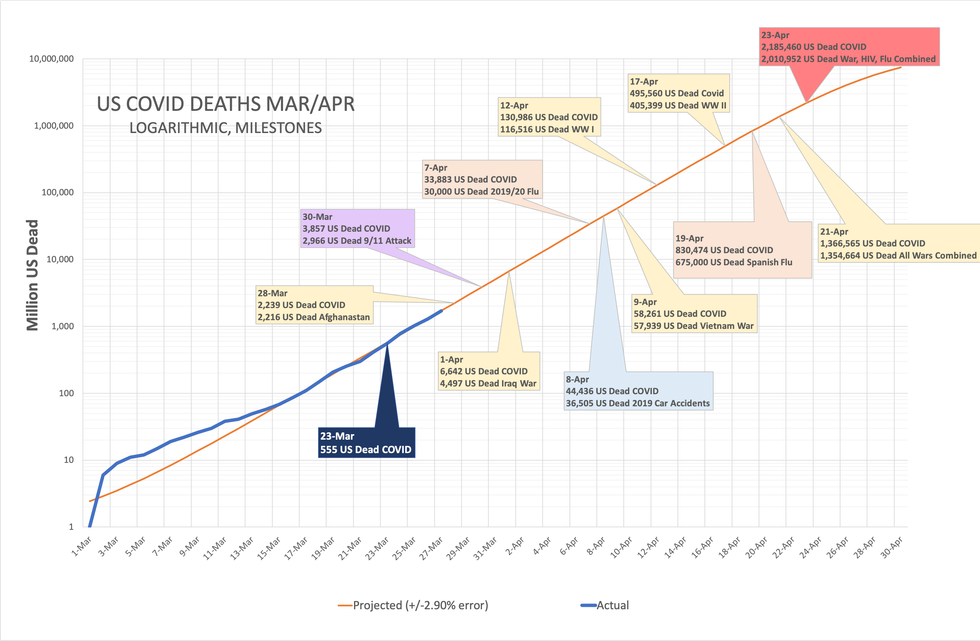 What that chart shows so well is that the growth of the pandemic is logarithmic—it’s exponential, with current rates of infection doubling every 2-3 days. That means that if we did nothing, just let the disease run its course, we’d have over 2 million dead in just three weeks.