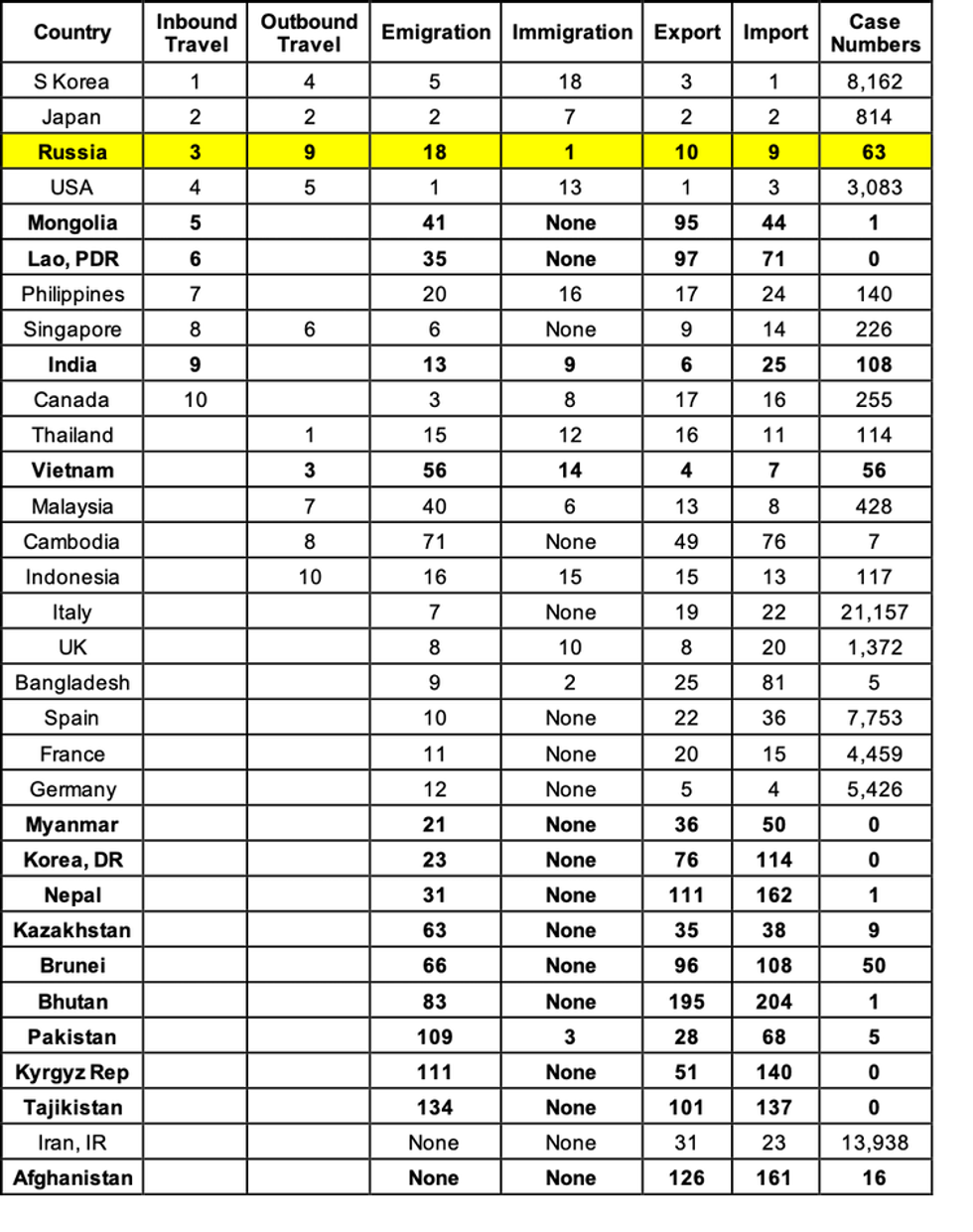 While this is a vastly simplified analysis of population movement, it is striking that there are only 63 cases reported in all of Russia. Given that Russia has very strong travel, emigration, immigration and trade relationships with China, its very low case numbers raise questions, especially as other countries with comparably close relationships (Japan, South Korea and the US) are experiencing significant local transmission.