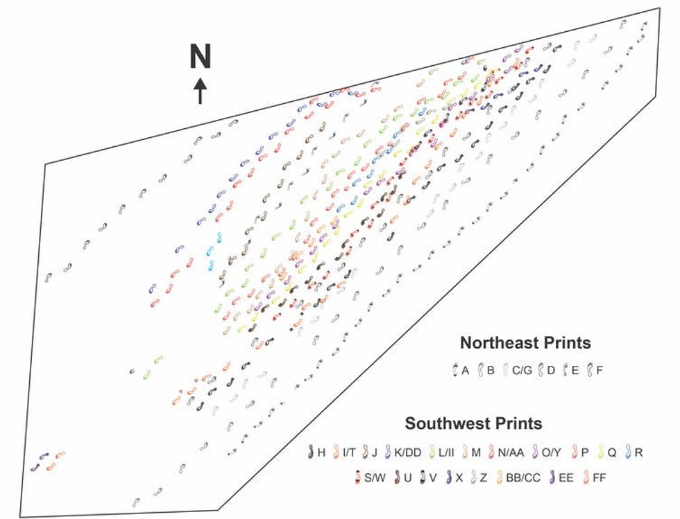 There are also six other footprint tracks heading in an almost perfectly opposite direction, to the northeast. Most of the people who made these footprints were walking at different speeds and at least one was running, suggesting that these tracks were not created by a single group traveling together.