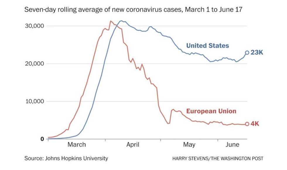 The far-too-rapid reopening of America, followed by the refusal to mandate masks or enforce social distancing, is the reason that the lines in this other Washington Post chart are so distinct.