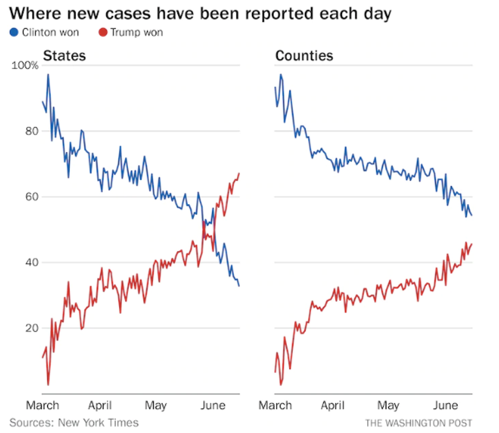 The amazing graphic from The Washington Post, showing how red states have taken over as the chief location of new cases, does not even include the data from the last half of this week.