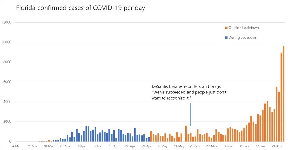 On May 20, Florida’s Republican Governor Ron DeSantis was continuing a statewide victory lap that saw him bragging about his “success” in handling the COVID-19 pandemic in every henhouse, outhouse and doghouse in the state—and on every right-wing media platform. Donald Trump held up Florida as the ultimate example of the benefits of reopening in a joint appearance with DeSantis on April 28 and was still at it on June 5, when Trump touted Florida for it’s “tremendous success.”