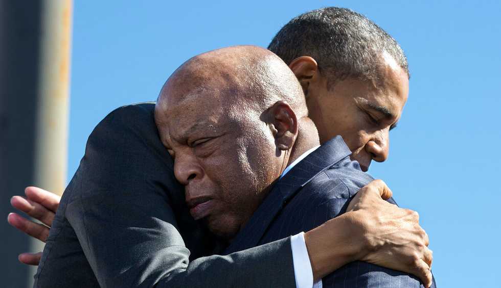 President Barack Obama hugs Rep. John Lewis, D-Ga. after his introduction during the event to commemorate the 50th Anniversary of Bloody Sunday and the Selma to Montgomery civil rights marches, at the Edmund Pettus Bridge in Selma, Ala., March 7, 2015. (Official White House Photo by Pete Souza)