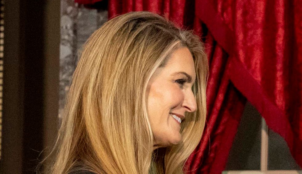 From there, it cuts to a scene of someone pretending to be Attila the Hun in a ridiculous set and costume. He shouts nonsense at a "scribe," which the scribe then relays in English as supposedly conservative policies that Loeffler and Attila share: attacking China and "big government," for example. In a thinly veiled and menacing threat to the press, one of the orders turns out to be "eliminate liberal scribes." Just more casual threats of violence to the media from the Republican Party, as we've come to expect.