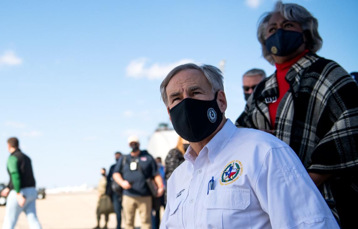 Texas Governor Greg Abbott watches as Airmen with the 502nd Logistics Readiness Squadron assists with the coordinating and unloading of approximately 80,000 bottles of water brought in via aircraft at Kelly Field to be distributed to the city of San Antonio following Winter Storm Uri, Feb. 21, 2021, at Joint Base San Antonio-Kelly Field, Texas.