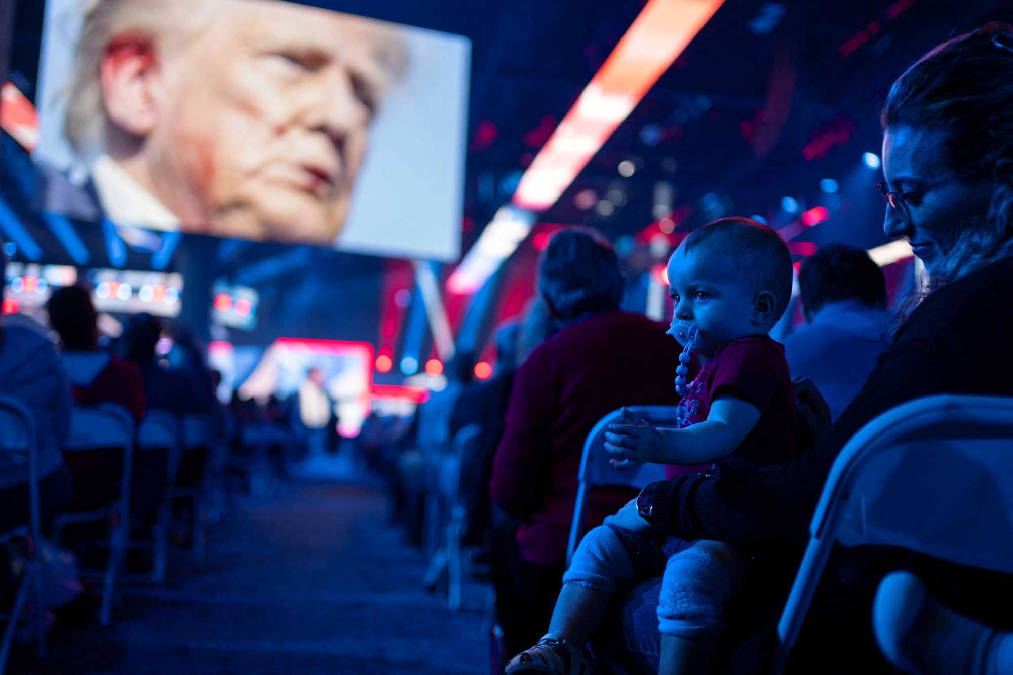 A woman carries a child as an image of U.S. President Donald Trump is displayed on a screen during AmericaFest, the first Turning Point USA summit since the assassination of Charlie Kirk, in Phoenix, Arizona, U.S. December 20, 2025. REUTERS/Cheney Orr