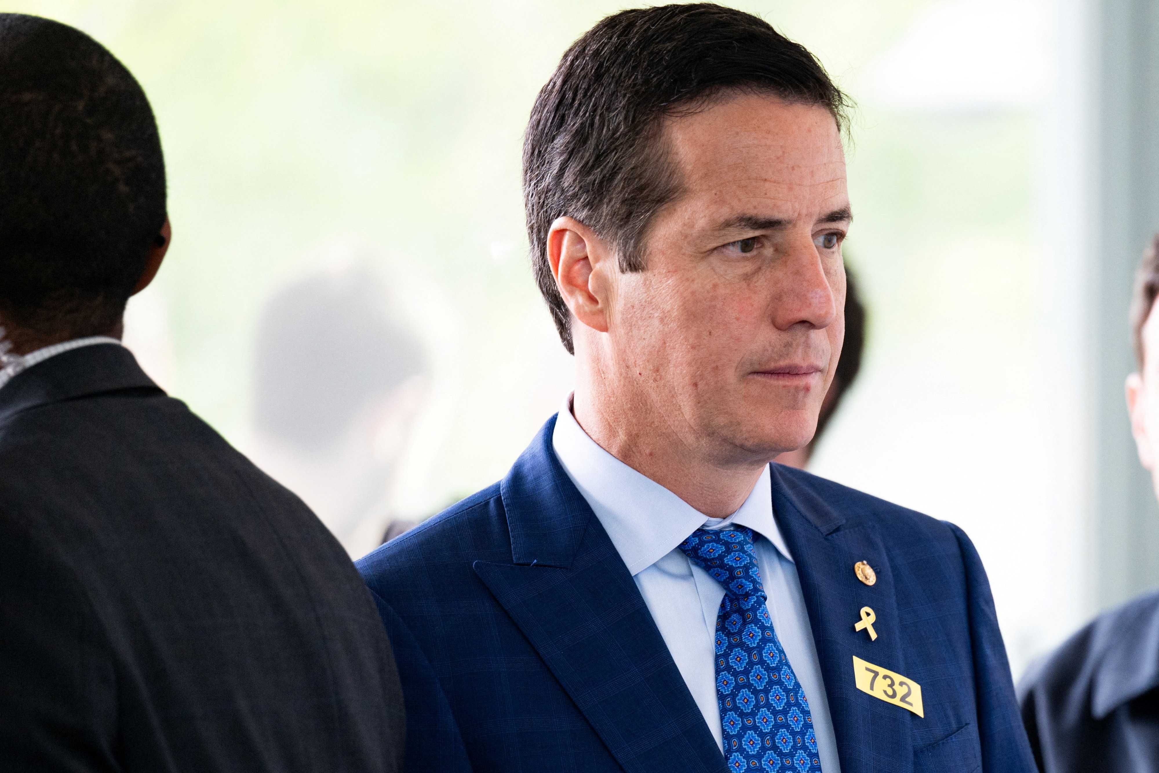 U.S. Senator Bernie Moreno (R-OH) joins as former hostages and family members of current hostages gather for a vigil and news conference, marking the two-year anniversary of the October 7 Hamas attacks on Israel, at the Kennedy Center in Washington, D.C., U.S., October 7, 2025. REUTERS/Annabelle Gordon