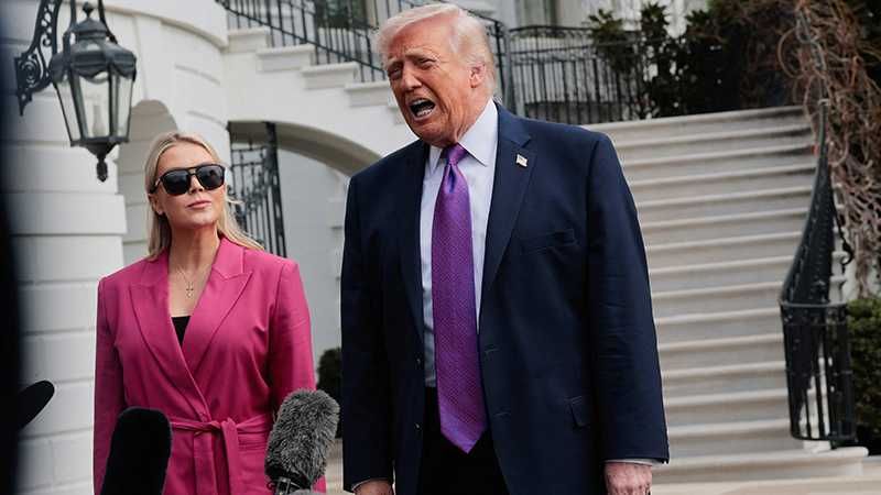 U.S. President Donald Trump speaks to the media next to White House press secretary Karoline Leavitt, at the White House in Washington, D.C., U.S., March 11, 2026. REUTERS/Brian Snyder