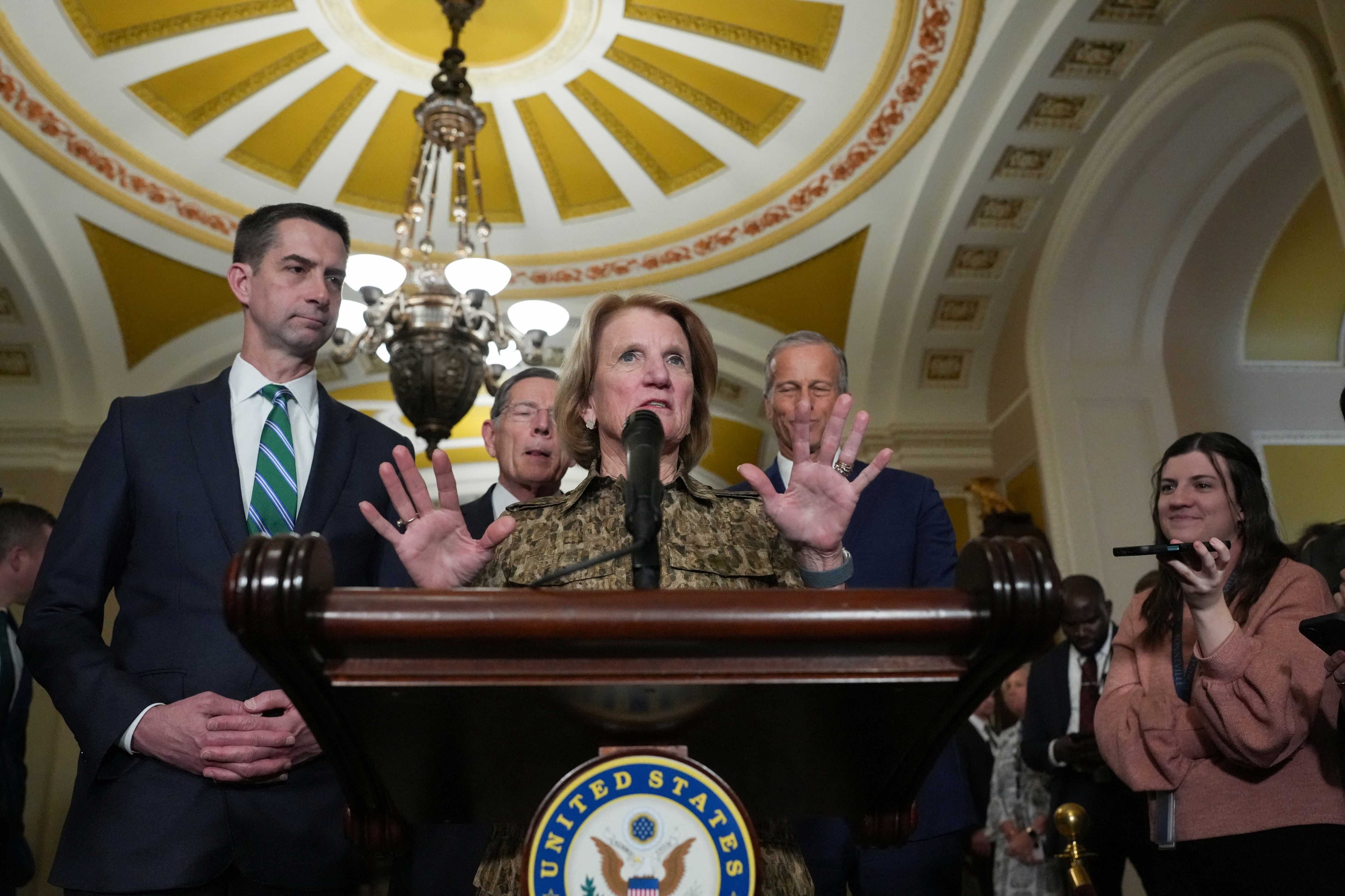 Republican Policy Committee Chair Shelley Moore Capito (R-WV) speaks during a press conference, following the weekly policy lunch on Capitol Hill in Washington, D.C., U.S., March 17, 2026. REUTERS/Ken Cedeno