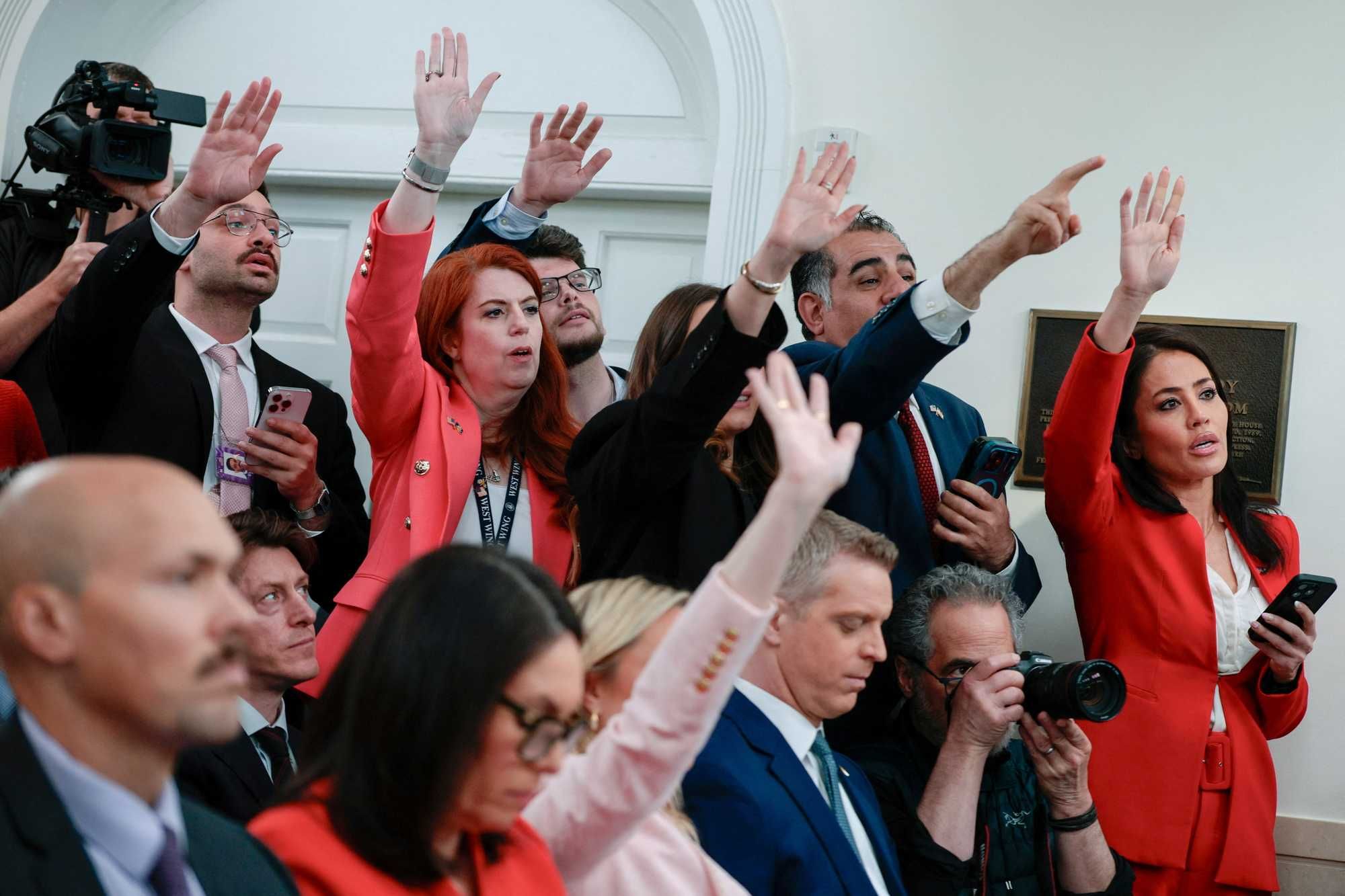 Reporters raise their hands during a press briefing with White House Press Secretary Karoline Leavitt at the White House in Washington, D.C., U.S., March 10, 2026. REUTERS/Evan Vucci