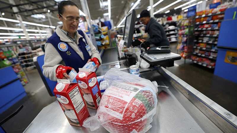 A cashier loads a turkey and other groceries for checkout at a Walmart Supercenter retail store in North Bergen, New Jersey, U.S., November 21, 2025. REUTERS/Mike Segar/File Photo