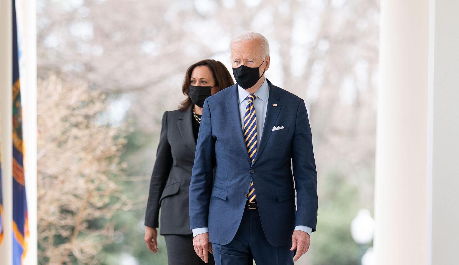 President Joe Biden and Vice President Kamala Harris walk from the Oval Office of the White House Friday, March 12, 2021, to the Rose Garden to deliver remarks on the American Rescue Plan.