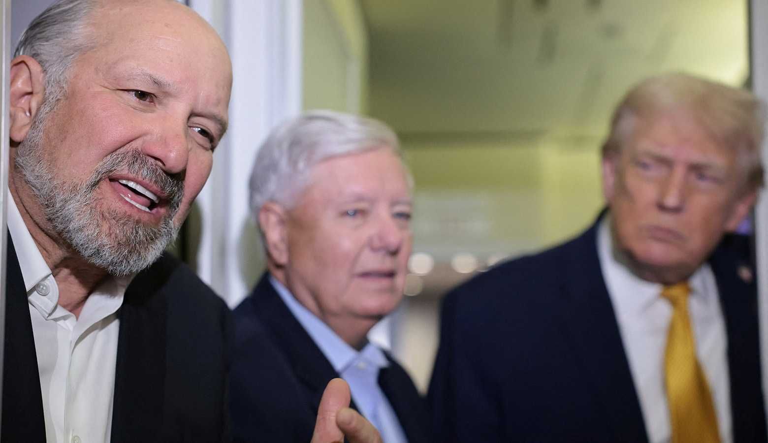 U.S. Secretary of Commerce Howard Lutnick and Senator Lindsey Graham (R-SC) join President Donald Trump to speak to reporters aboard Air Force One en route from Florida to Joint Base Andrews, Maryland, U.S., January 4, 2026. REUTERS/Jonathan Ernst