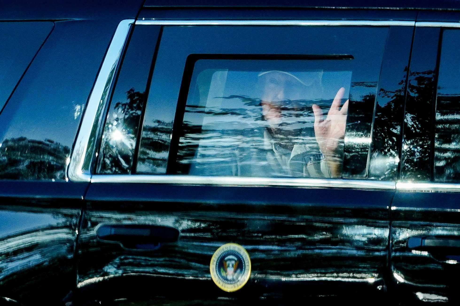 U.S. President Donald Trump waves from a car as he departs after golfing at Trump National Golf Club in Sterling, Virginia, U.S., October 4, 2025. REUTERS/Aaron Schwartz