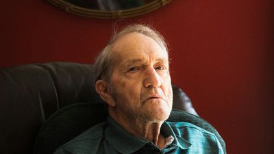 man in blue sweater sitting on black sofa