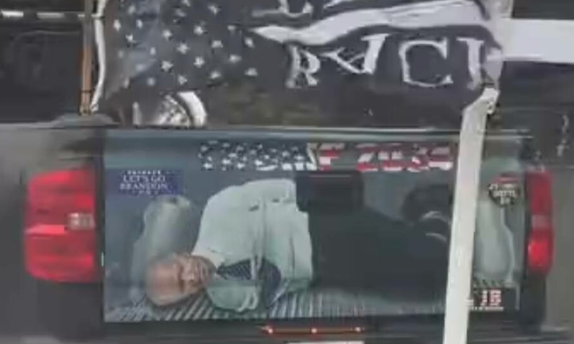 On Friday afternoon, former President Donald Trump posted a video to his Truth Social account of two trucks driving on a highway decked out in pro-Trump flags and stickers. One truck had a decal spanning its entire back gate made to resemble a truck bed carrying President Joe Biden, bound and gagged like a kidnapping victim.