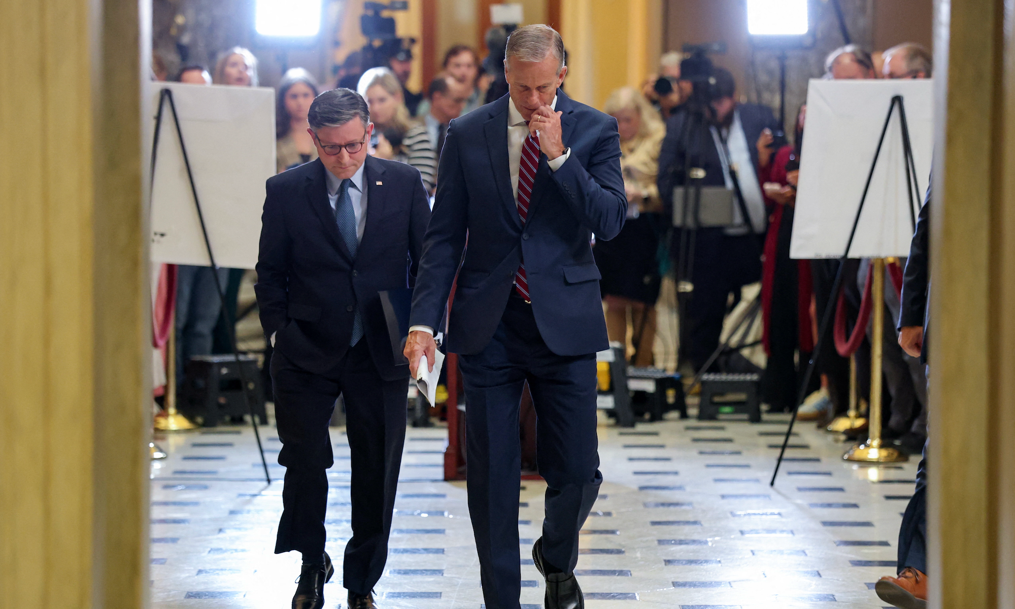 U.S. House Speaker Mike Johnson (R-LA) and Senate Majority Leader John Thune (R-SD) leave following a press conference on the third day of a partial shutdown of the federal government at the U.S. Capitol in Washington, D.C., U.S. October 3, 2025. REUTERS/Jonathan Ernst