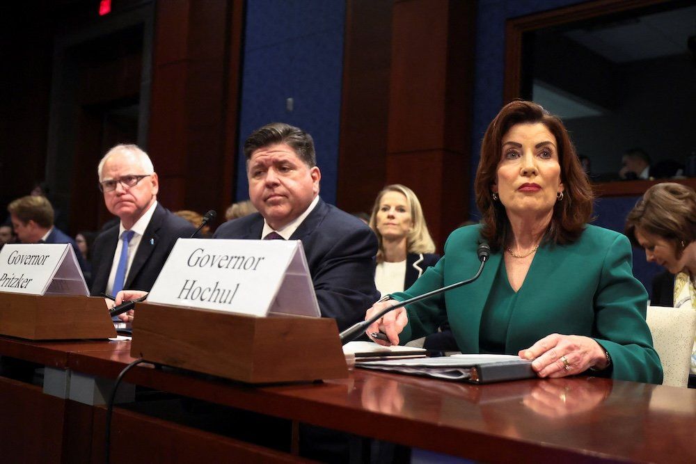 New York Governor Kathy Hochul, Illinois Governor JB Pritzker and Minnesota Governor Tim Walz attend a House Oversight Committee hearing with U.S. governors about state policies regarding undocumented migrants, on Capitol Hill in Washington, D.C., U.S., June 12, 2025. REUTERS/Kevin Lamarque