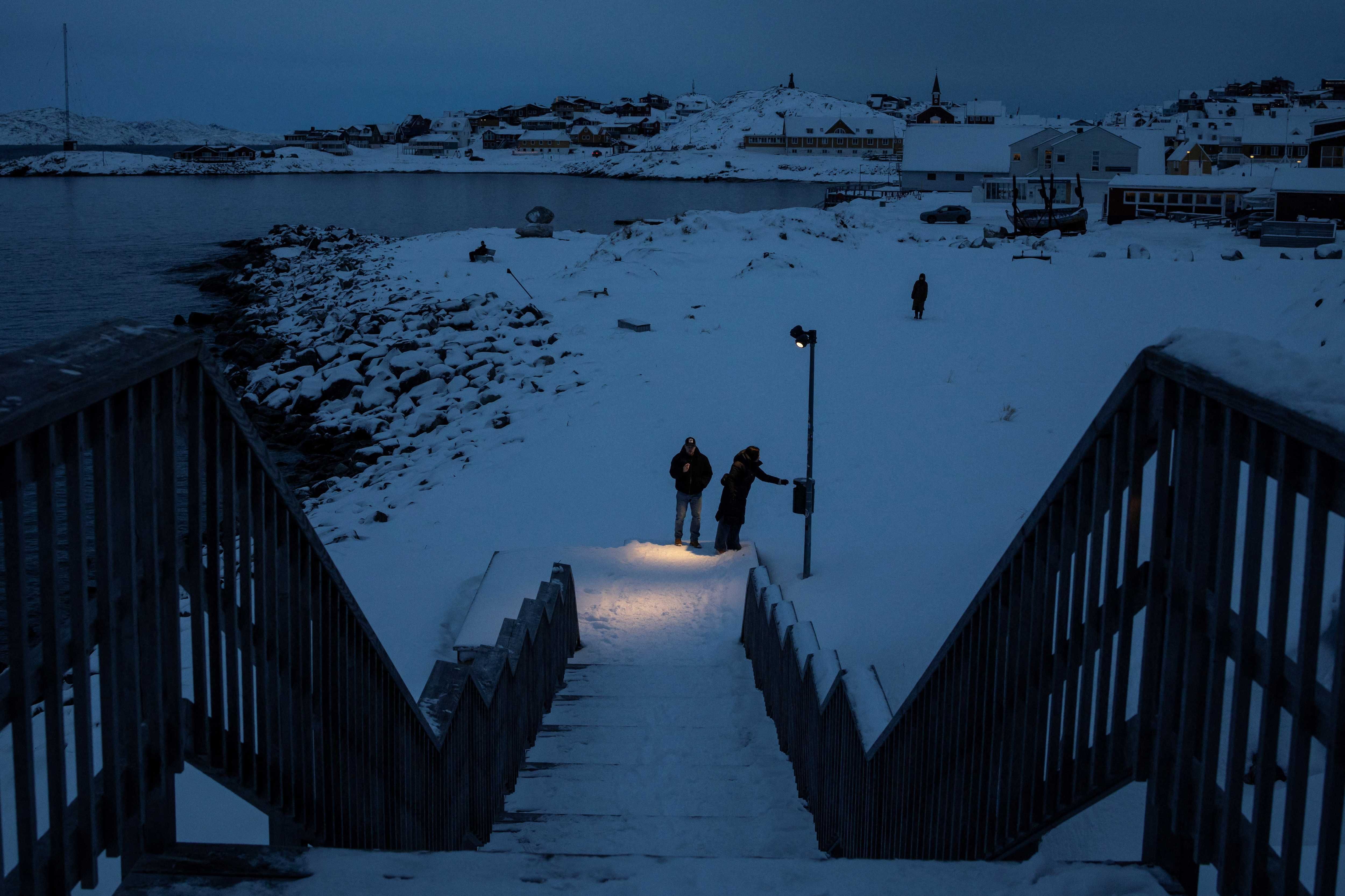 People walk by the sea at Nuuk's old harbour, Greenland, January 13, 2026. REUTERS/Marko Djurica